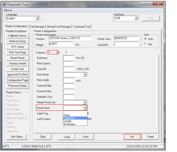 2) Для автоматической калибровки принтера этикеток при закрытии печатающей головки - для параметра «Head Close» выберите значение «Calibration». Далее нажмите кнопку «Set», чтобы загрузить указанный параметр в принтер.
